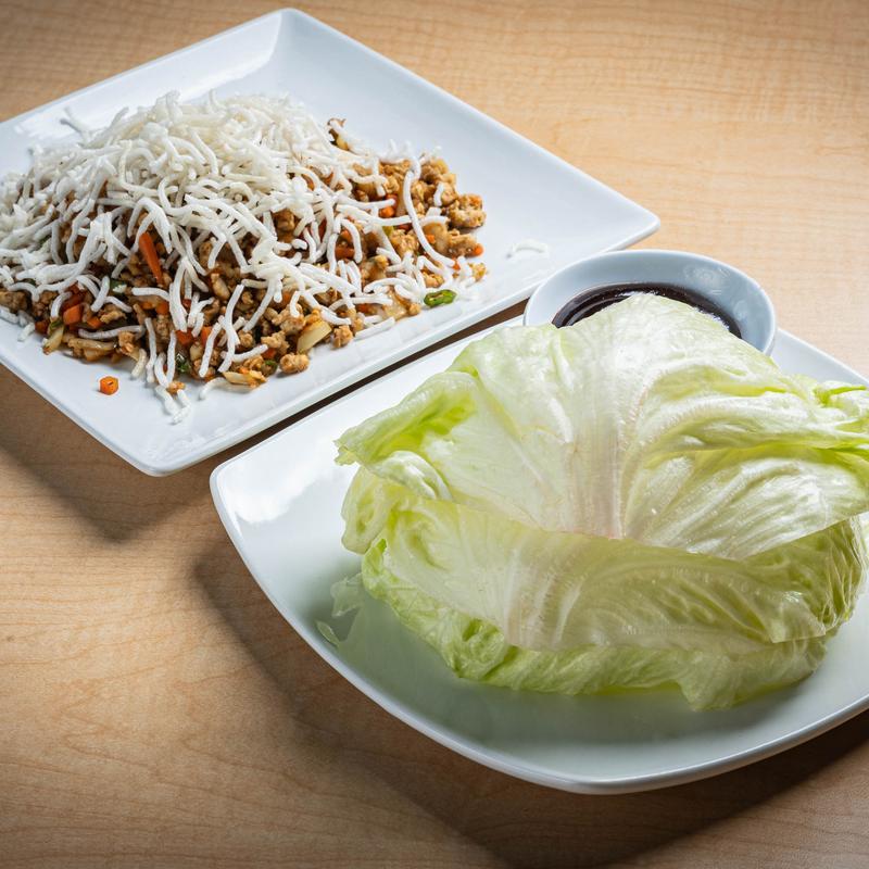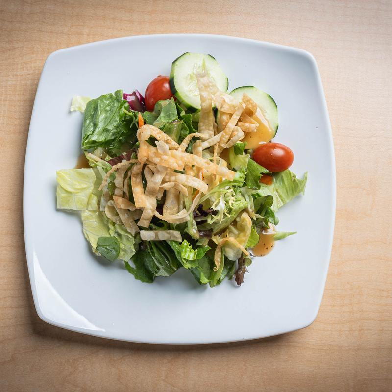 Iceberg lettuce and spring mix garnished with seasonal vegetables and topped with fried wonton strips.
