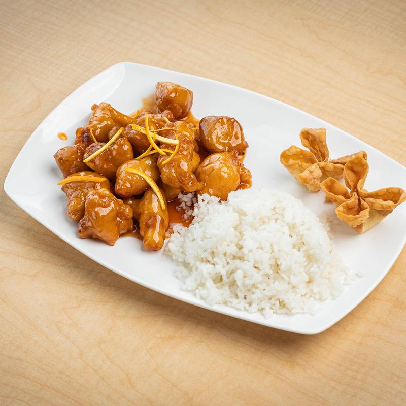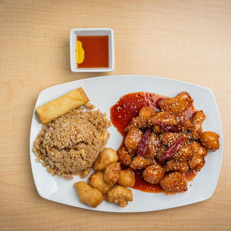 Served with choice of egg drop or hot & sour soup (sub soup for salad +$1.50), choice of cream cheese wonton or fried spring roll, and ham fried rice.