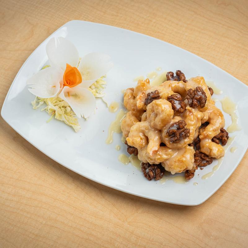 Breaded shrimp fried, then mixed in a sweet, creamy sauce over honey-glazed walnuts.