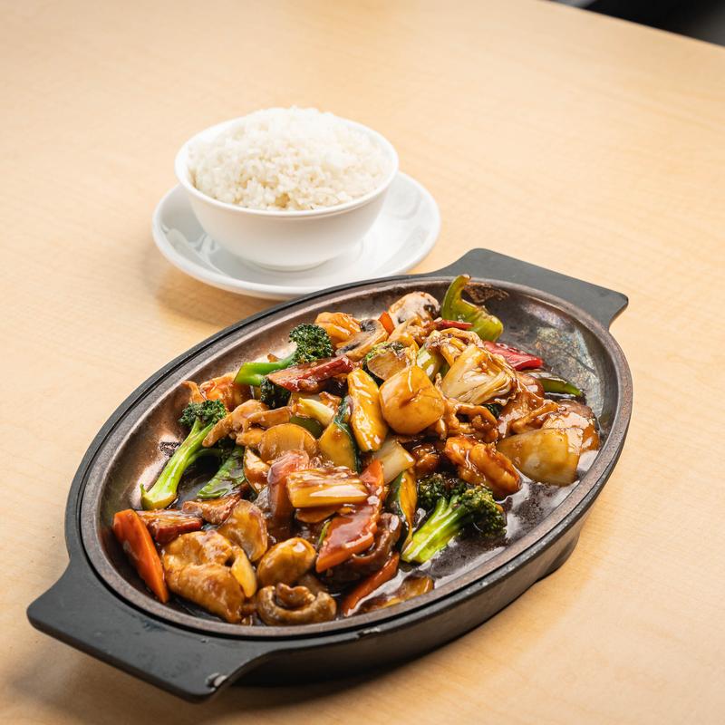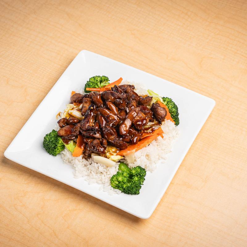 Served over rice or noodles and choice of egg drop or hot & sour soup.