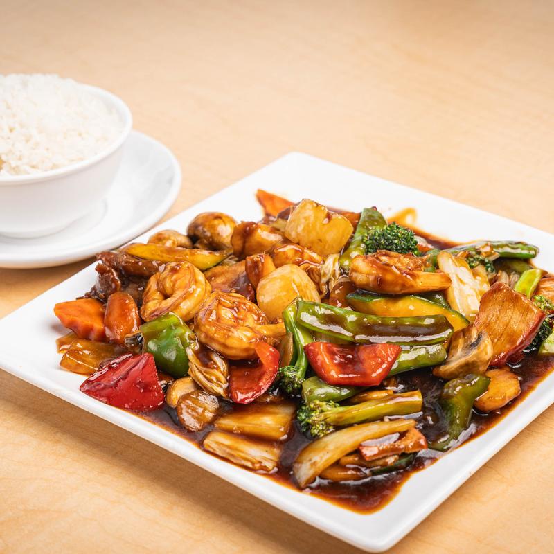 A combination of shrimp, scallop, char shu, and chicken stir fry with vegetables.