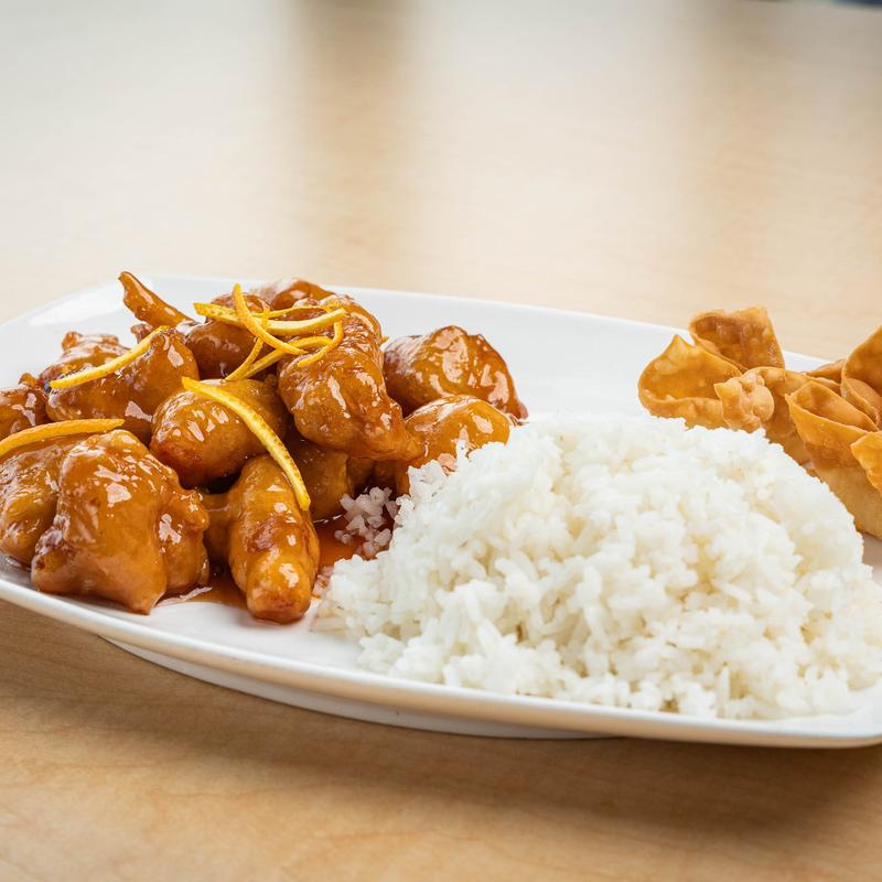 Served over rice or noodles w/ choice of egg drop or hot & sour soup.